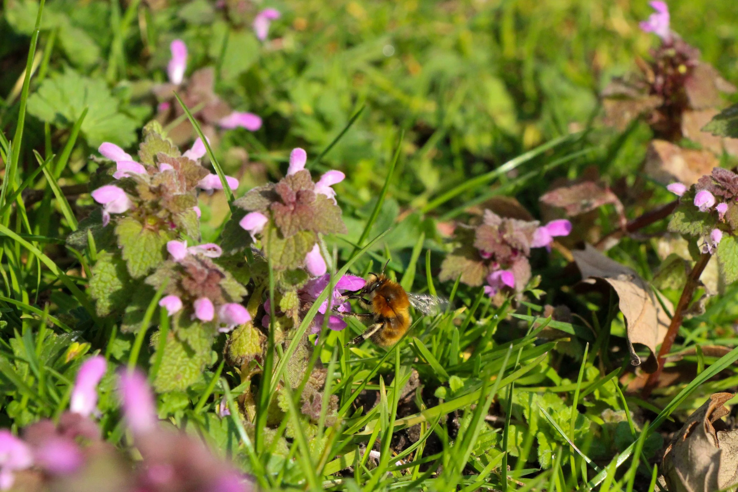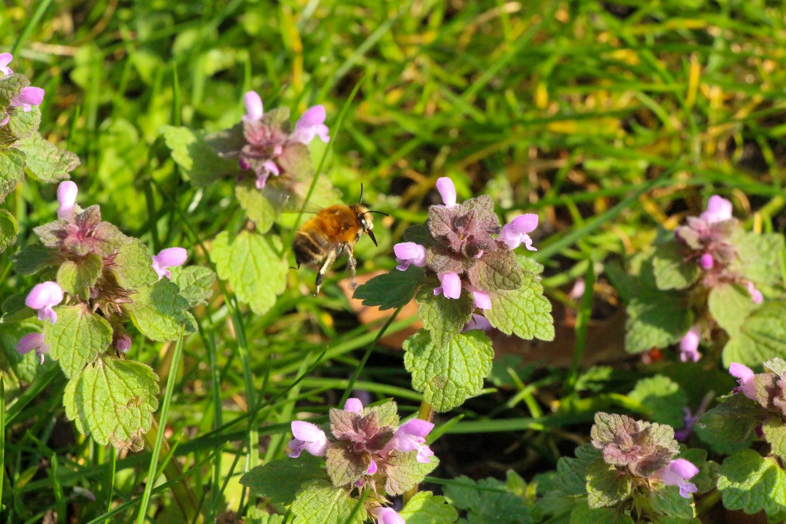 Bee mid flight with Lamium purpureum